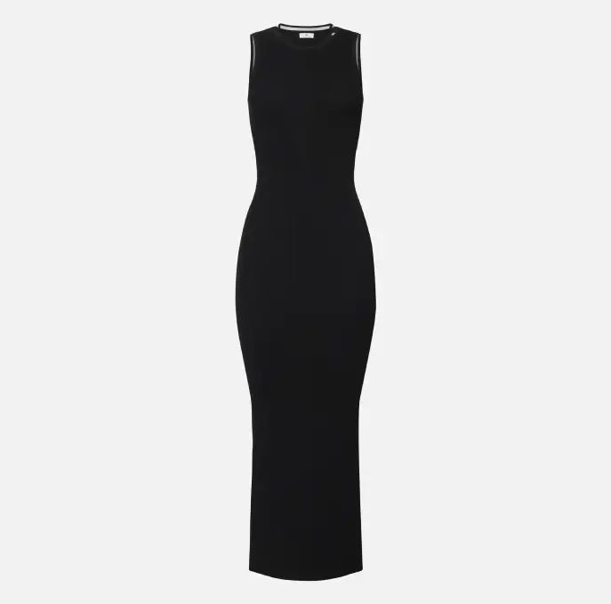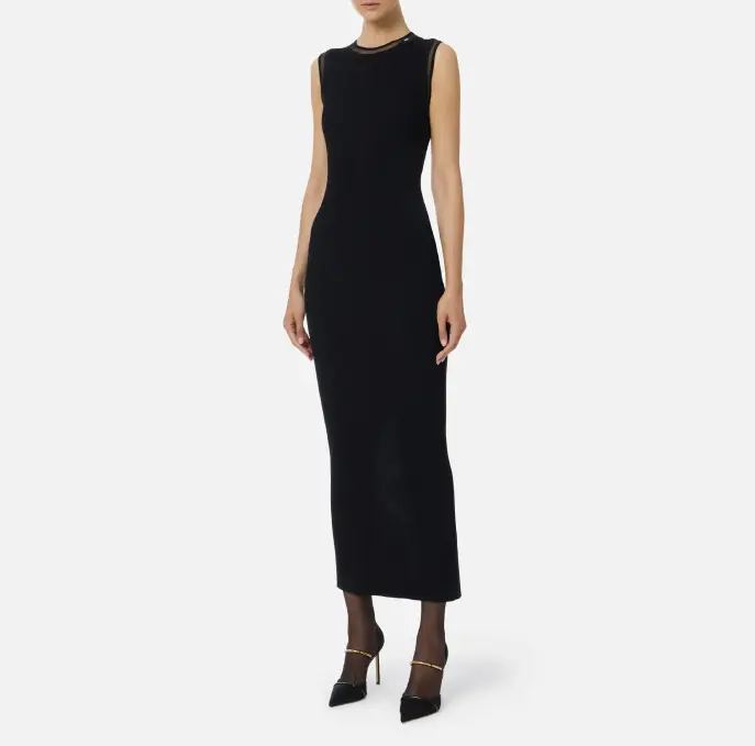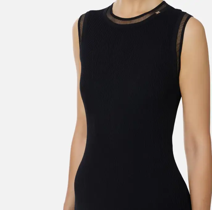 Abito in maglia dalla vestibilità aderente. Il vestito è smanicato e si distingue per la lavorazione a costine con motivi geometrici che disegnano la silhouette. I bordi in nylon a contrasto creano particolari giochi di trasparenza. Dettaglio con logo e strass sullo scollo.