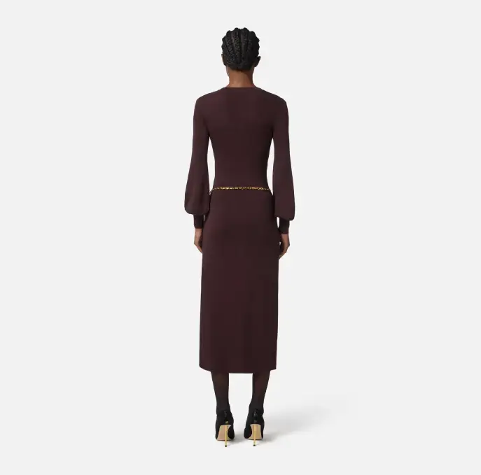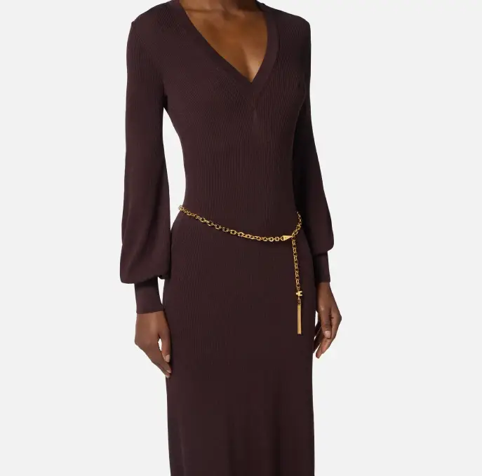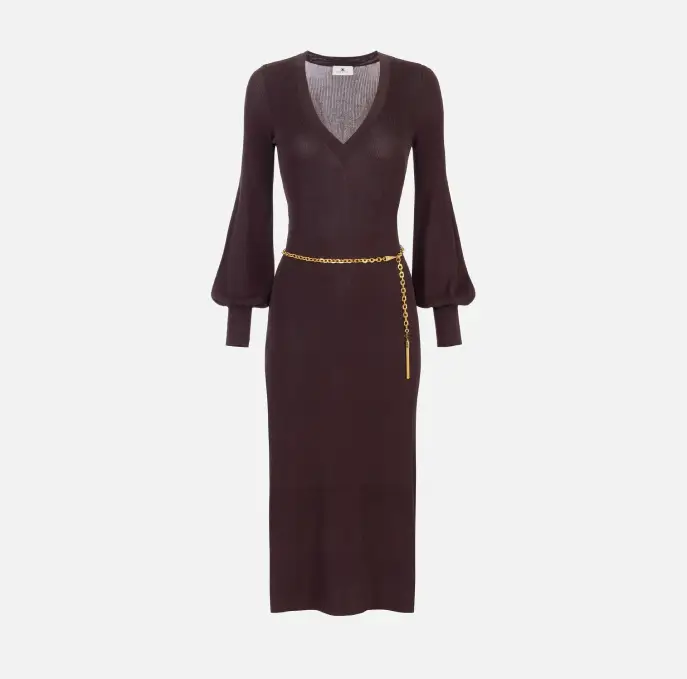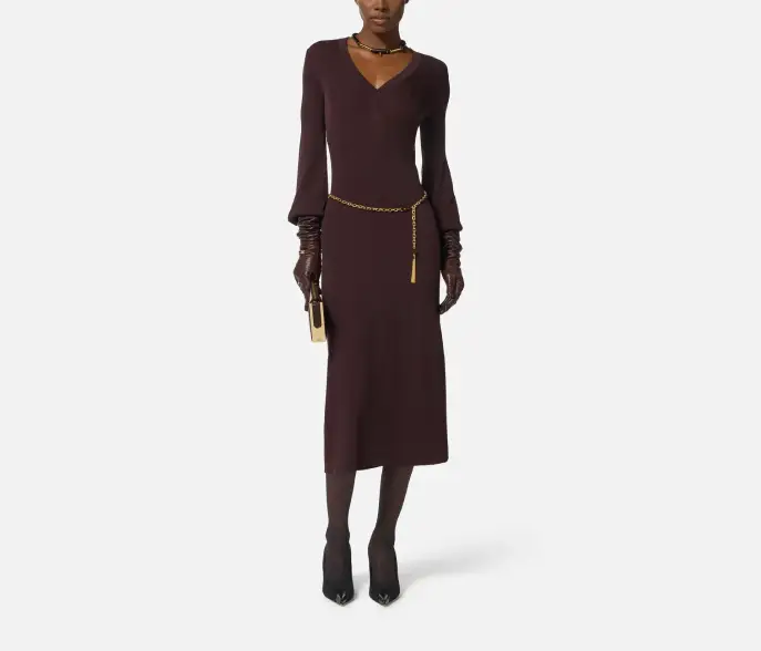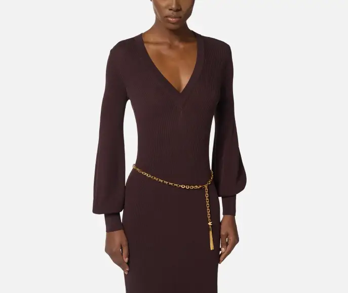 Abito in maglia realizzato in filato di viscosa e seta con lavorazione a costine. Il vestito ha profondo scollo a V, maniche lunghe ampie al fondo e gonna svasata. Impreziosito dalla cintura in catena con moschettone e nappina in trama snake che aggiunge movimento e luce. Vestibilità slim.