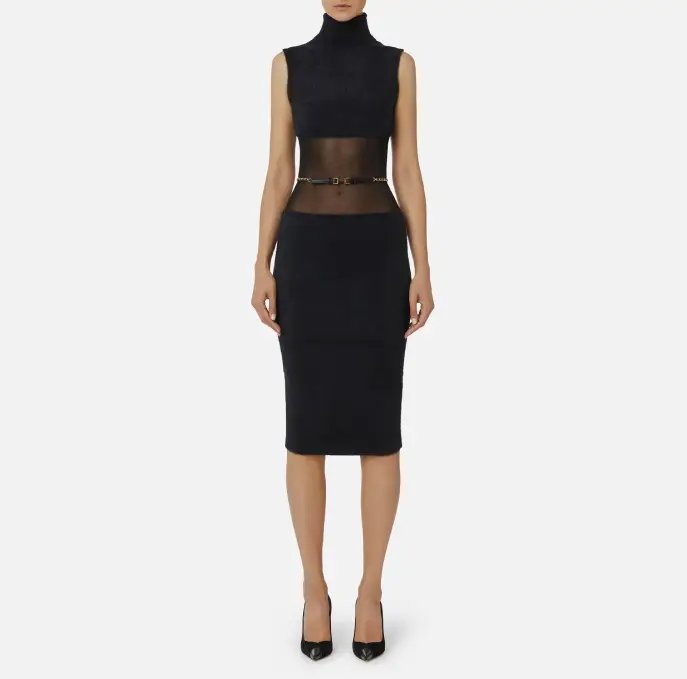 Abito in maglia dalla vestibilità aderente. Il vestito è smanicato con collo dolcevita e gonna longuette. Si distingue per la particolare lavorazione che regala morbide texture effetto pelo e per i giochi di trasparenze con la trama garzata in vita. La cintura con catena e logo illumina il capo.