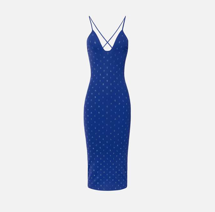Abito midi in viscosa stretch con motivo di strass lettering all-over. È caratterizzato da scollo incrociato sul davanti.