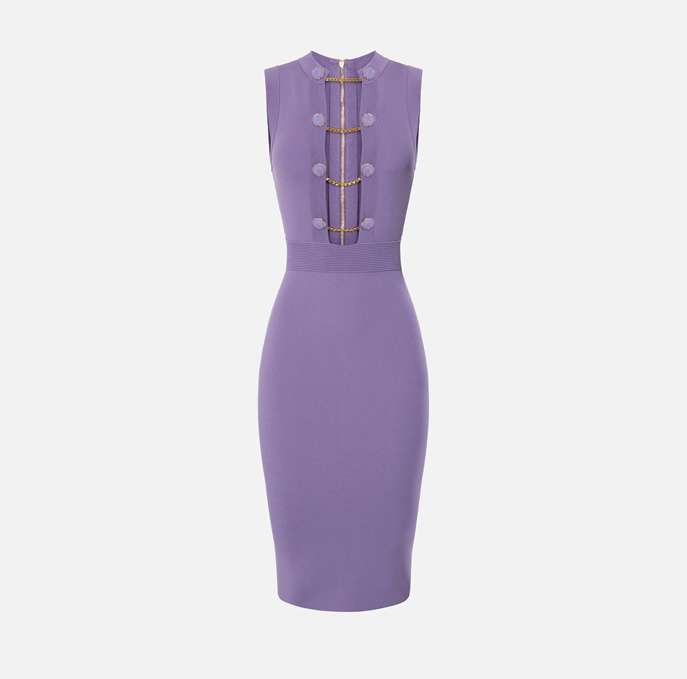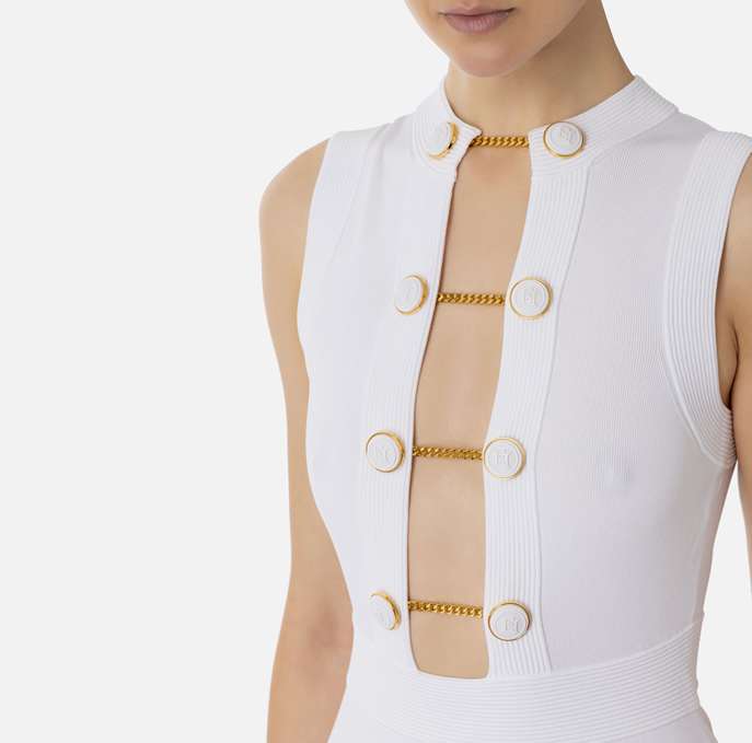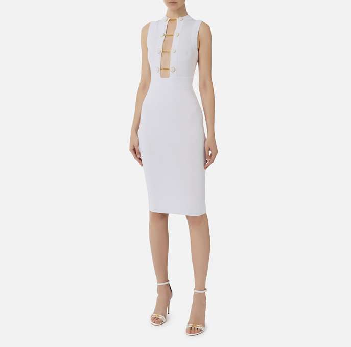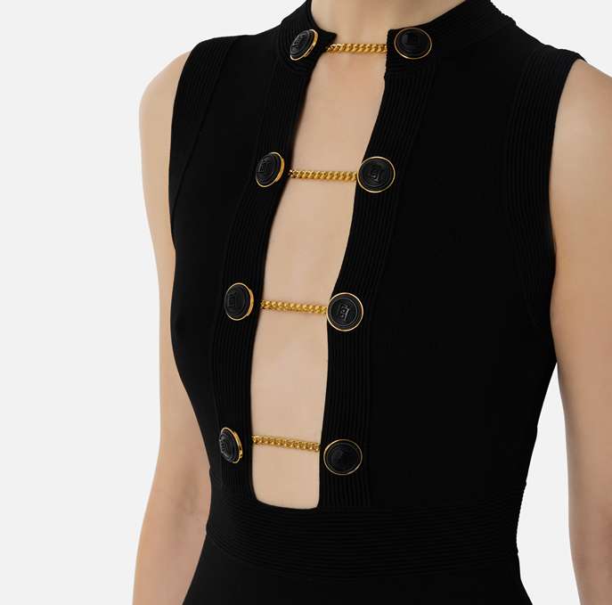 Tubino in viscosa lucida con profonda scollatura chiusa da bottoni gemello in tono.