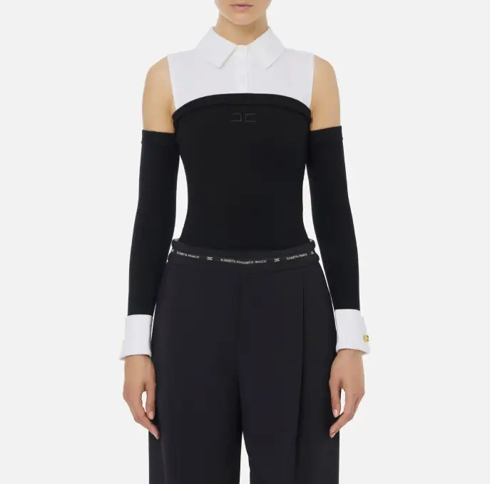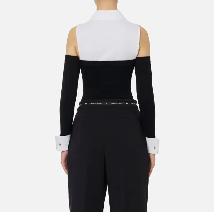 Body in maglia di viscosa con spalle in popeline di cotone, a ricreare un effetto camicia con colletto classico e abbottonatura nascosta con primo bottone a vista. Il dettaglio di stile sono le maniche staccate dal capo con polsini decorati da gemelli. Con logo ricamato, ha vestibilità aderente.