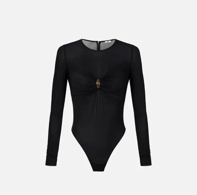 Body in jersey dalla vestibilità aderente. Ha girocollo e maniche lunghe. Si distingue per il drappeggio centrale trattenuto dalla placca gioiello smaltata, impreziosita dal pattern di ispirazione snake.