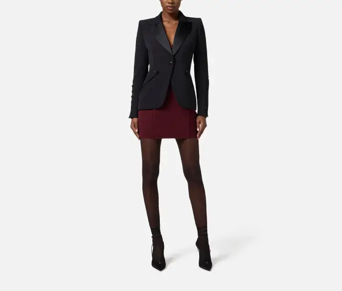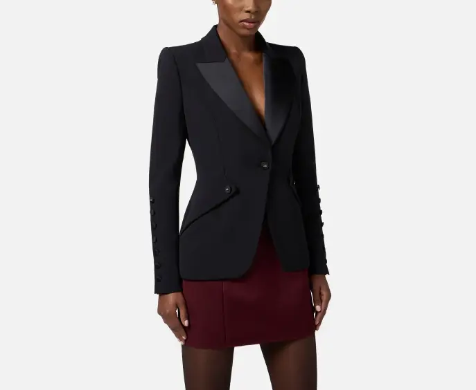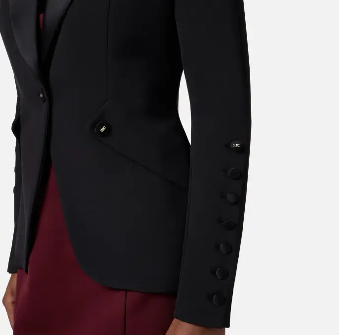 Giacca monopetto in crêpe leggero dalla vestibilità slim. Con richiami al tuxedo maschile, il blazer ha spalle strutturate, rever a lancia realizzati in raso e bottoni in tono. Le maniche presentano ampi spacchi con bottoni a pressione.