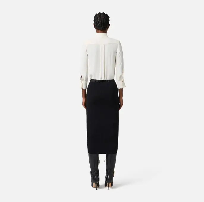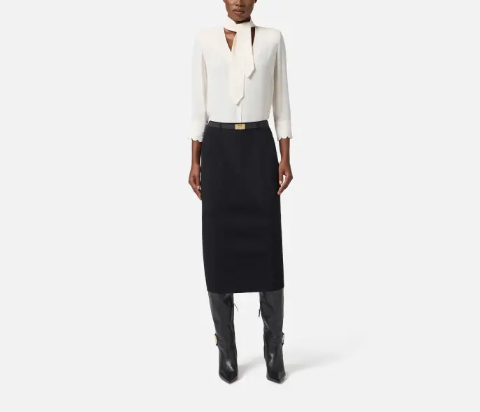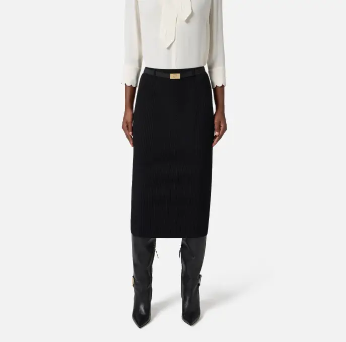 Gonna in maglia dalla vestibilità aderente. Si distingue per la lavorazione a costine che disegna la silhouette con motivi geometrici sul davanti. La cintura impreziosita dal logo con strass è trattenuta da passanti in tono e sottolinea il punto vita.