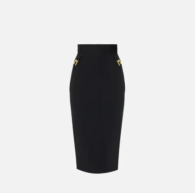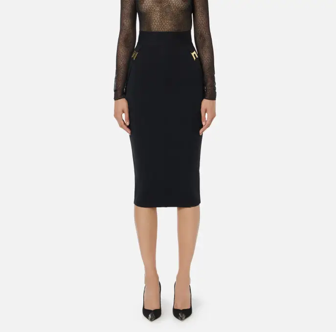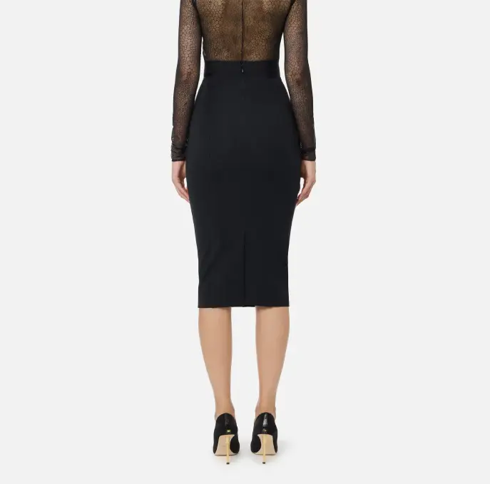 Gonna in tessuto bielastico dalla vestibilità aderente. Si distingue per i richiami al mondo della corsetteria come le impunture a zig-zag e i tagli effetto bustier che scolpiscono la silhouette. Inserti in tulle e dettagli gioiello con logo completano il capo.