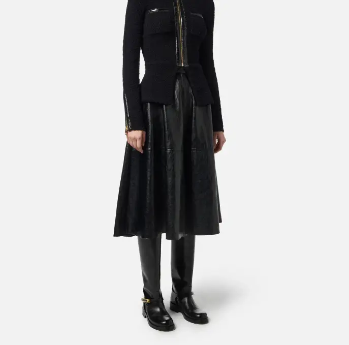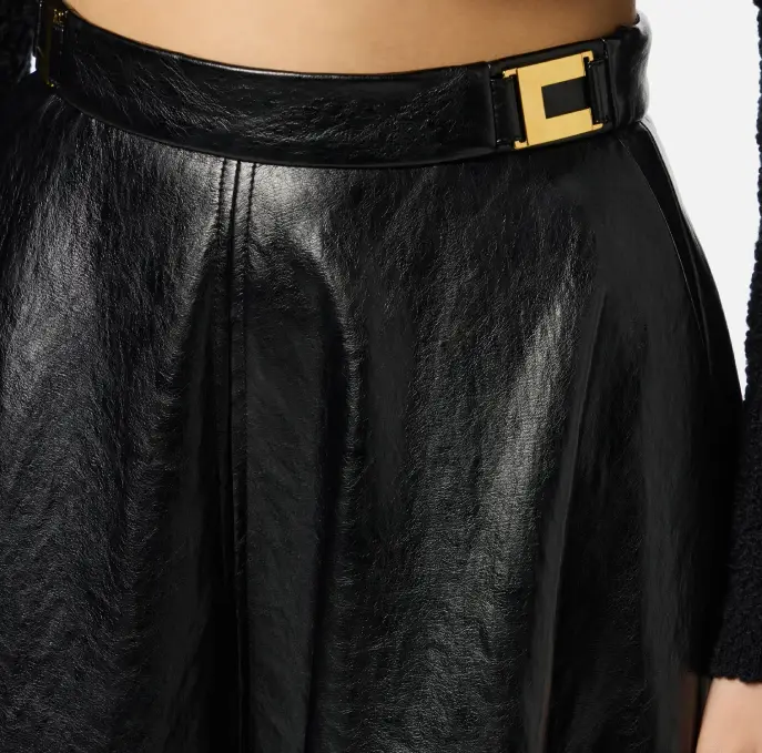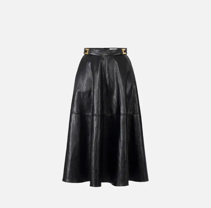 Gonna in materiale sintetico effetto pelle craquelé dalla vestibilità regular. Impreziosita dagli accessori con logo in metallo dorato, ha linea a ruota con fondo svasato che dona leggerezza ed eleganza al fit.