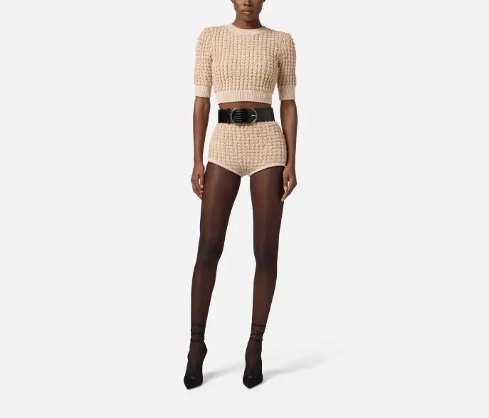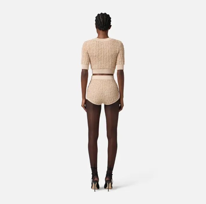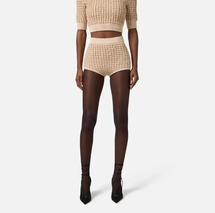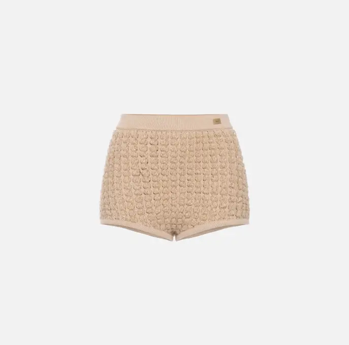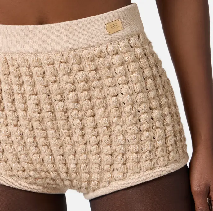 Shorts in bouclé dalla vestibilità aderente. Resi preziosi dalle micro-paillettes in trama, sono personalizzati dalla placca in metallo dorato con logo su un fianco.