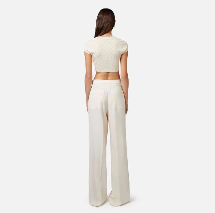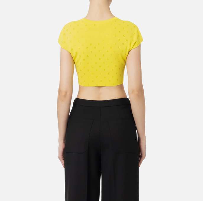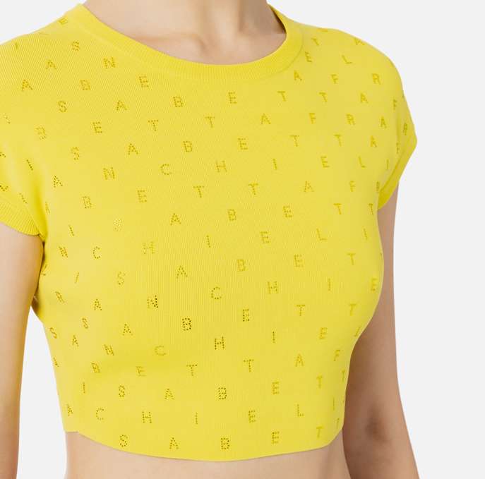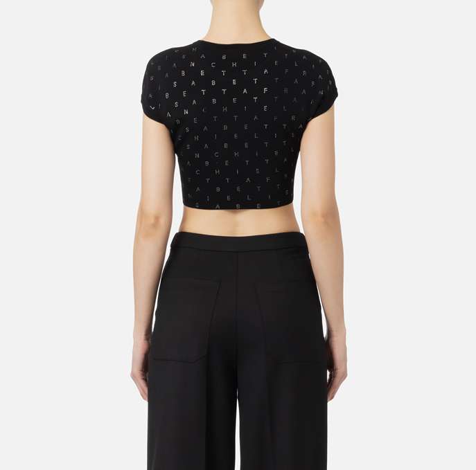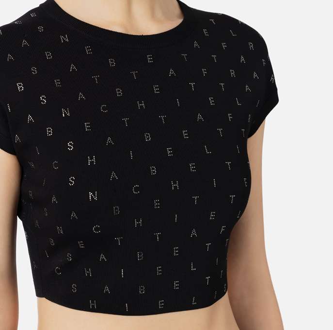 Top cropped in viscosa stretch con motivo di strass lettering all-over. È caratterizzato da maniche corte.