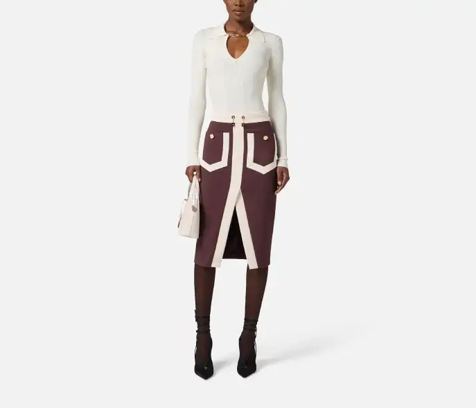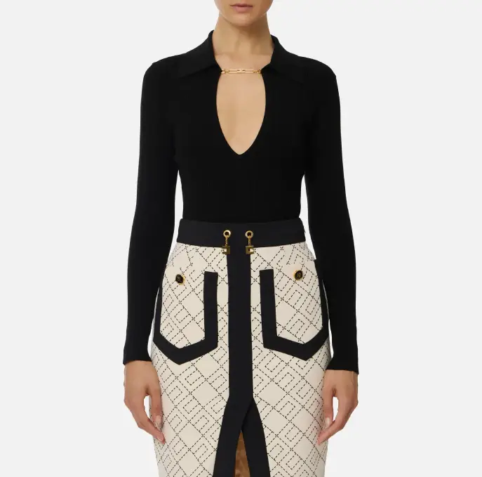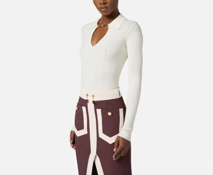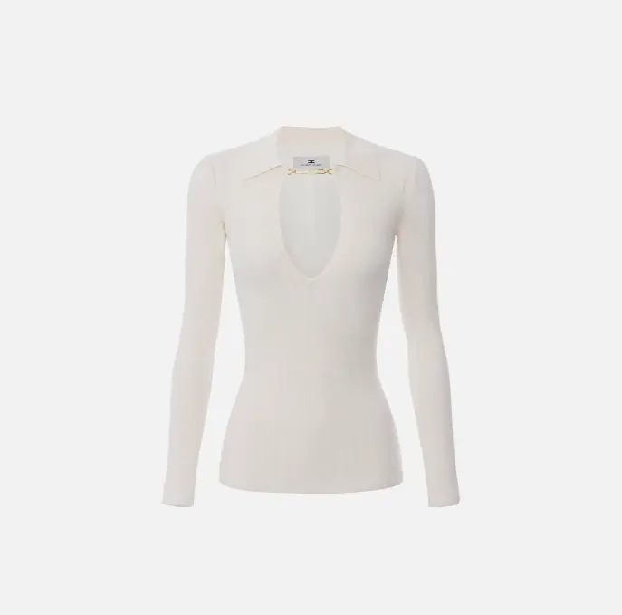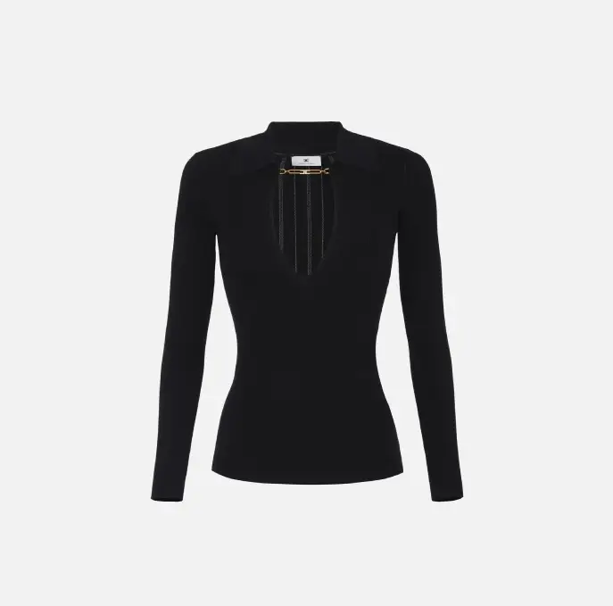 Maglia a costine dalla vestibilità aderente. Con colletto a polo e scollo a V, è impreziosita dall’accessorio gioiello in metallo dorato con logo e strass. La trama è ingentilita dai ricami à jour che regalano definizione e morbidezza.