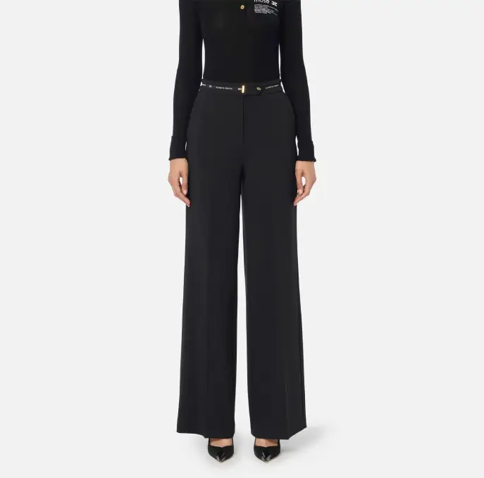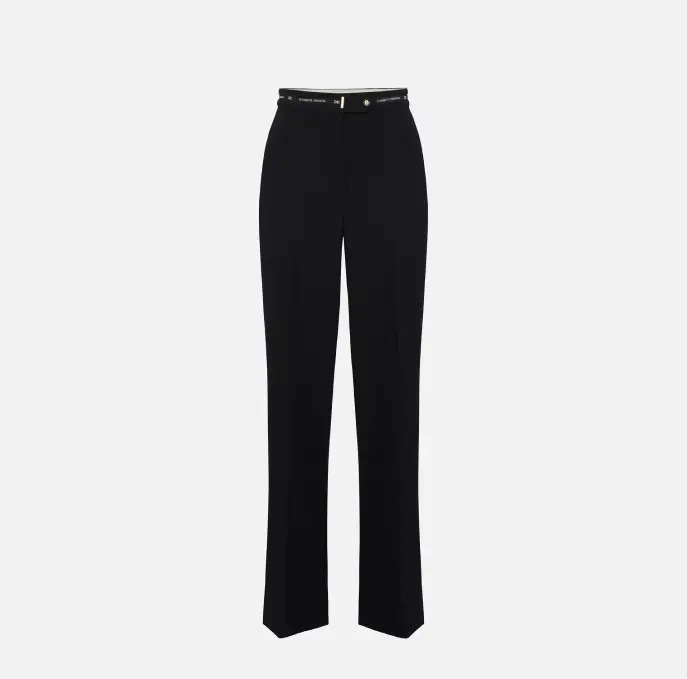 Pantaloni in crêpe leggero dalla vestibilità regular con linea a palazzo. Il dettaglio di stile è il nastro in vita ispirato alla sartoria maschile posizionato esternamente al capo, con logo a contrasto. Tasche alla francese e patte applicate sul retro.