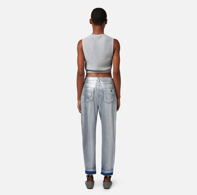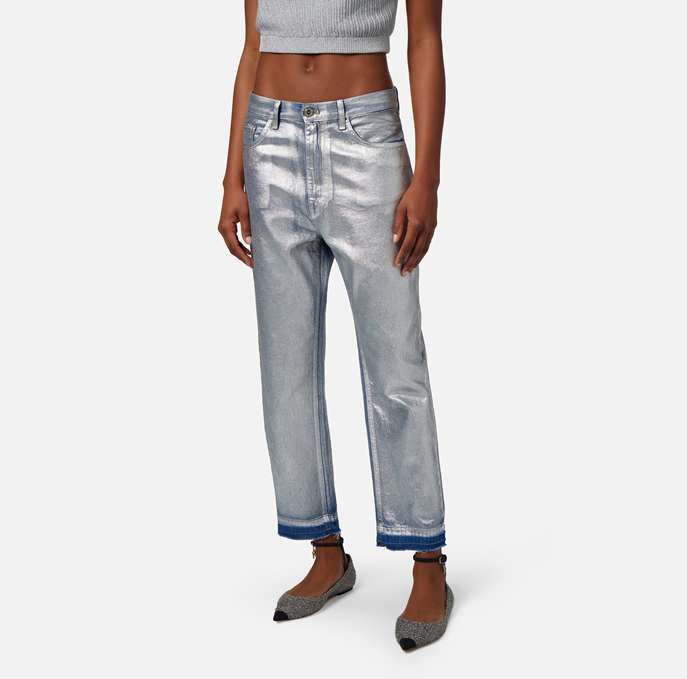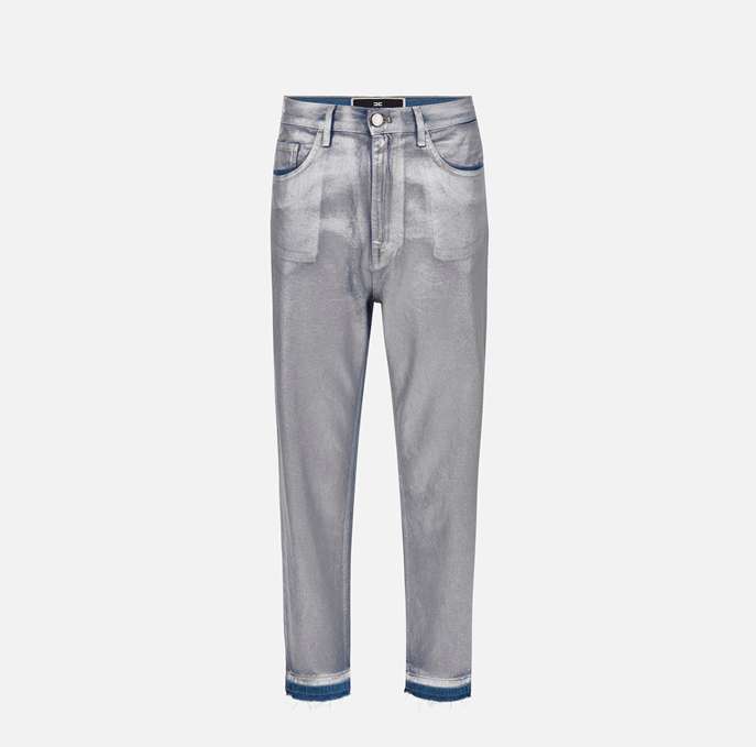Jeans boyfriend in cotone laminato con cavallo basso e vita regular. È caratterizzato da bottoni e accessori in metallo silver.