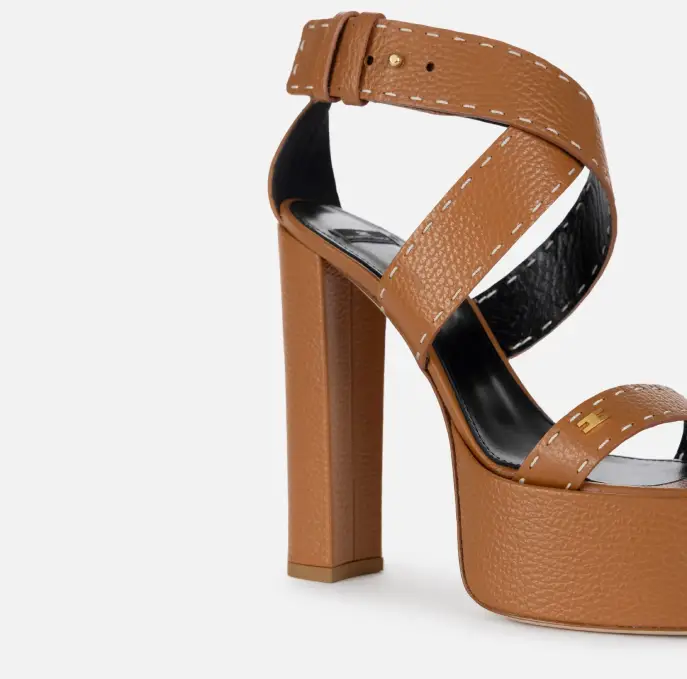 Sandali con plateau realizzati in pelle bottalata e con listini incrociati sul davanti. Rifiniti con impunture a vista e dettaglio logo, poggiano su un tacco a colonna fasciato in pelle. Chiusura con rivetti e passanti.