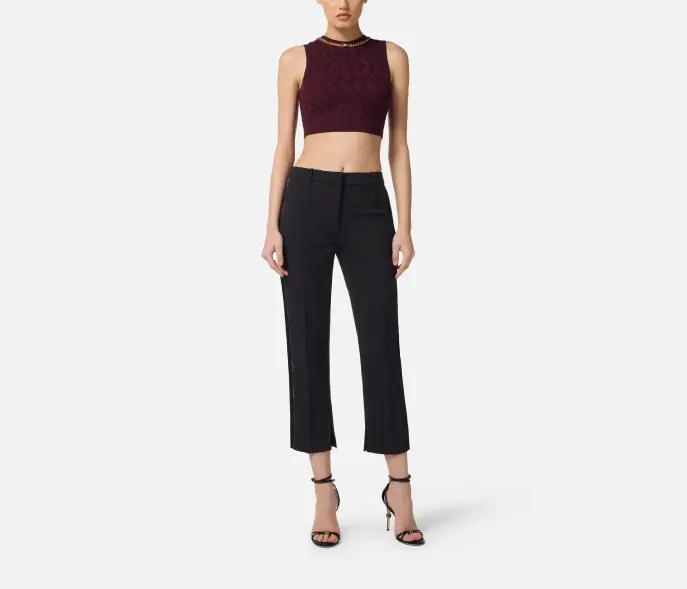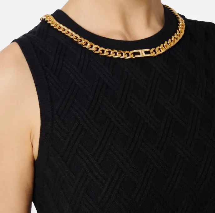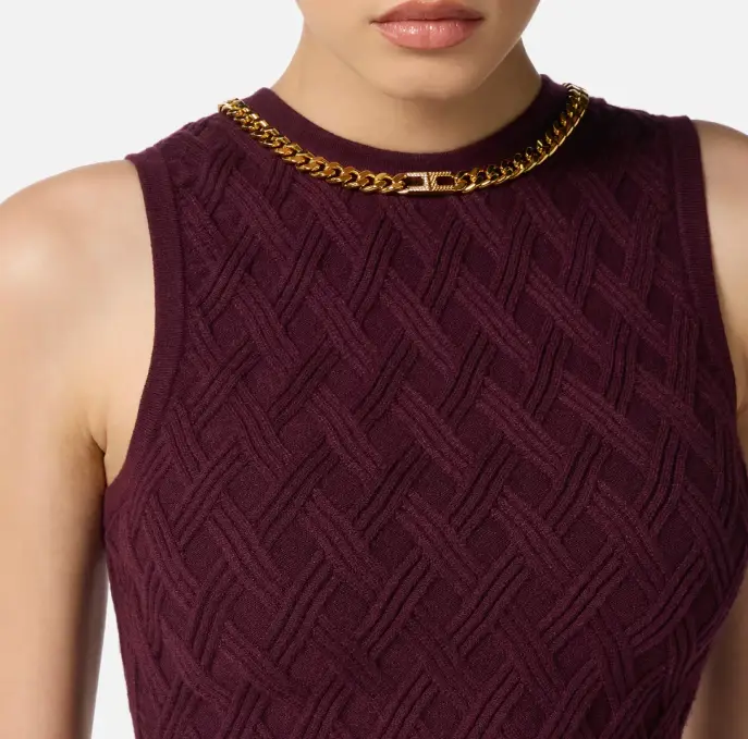 Top in maglia a rombi dalla vestibilità aderente. Si distingue per l’elaborata lavorazione 3D che crea un disegno geometrico a rombi su tutta la lunghezza. Impreziosito dalla catena groumette, ha scollo con zip e tirazip gioiello con logo sul retro.