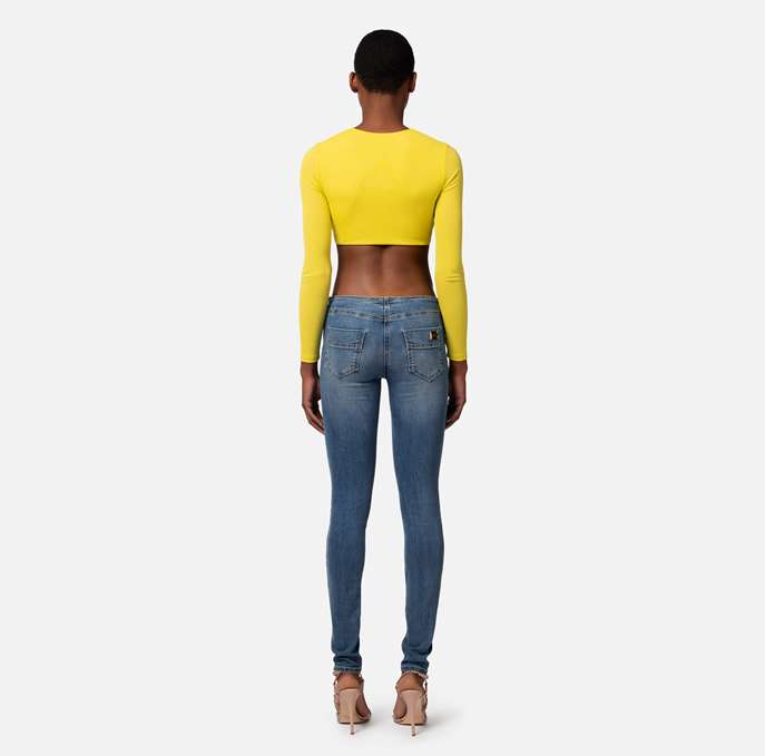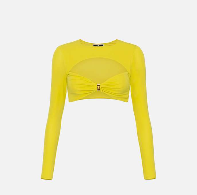 Maglia cropped in jersey crêpe leggero con maniche lunghe. È caratterizzata da un motivo centrale di coppe drappeggiate fermate al centro da un accessorio in metallo dorato.