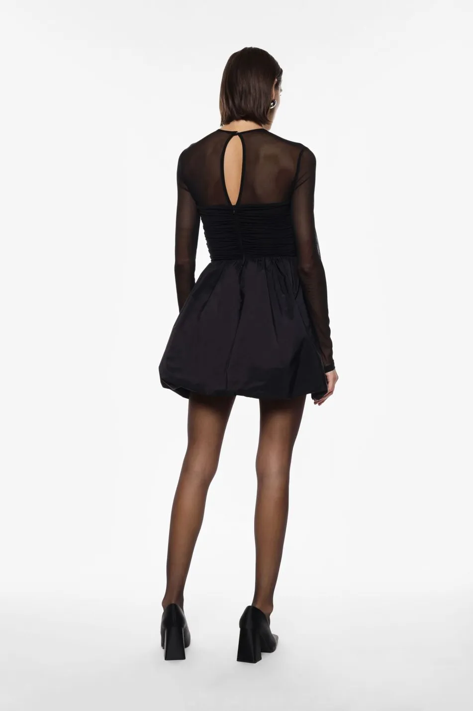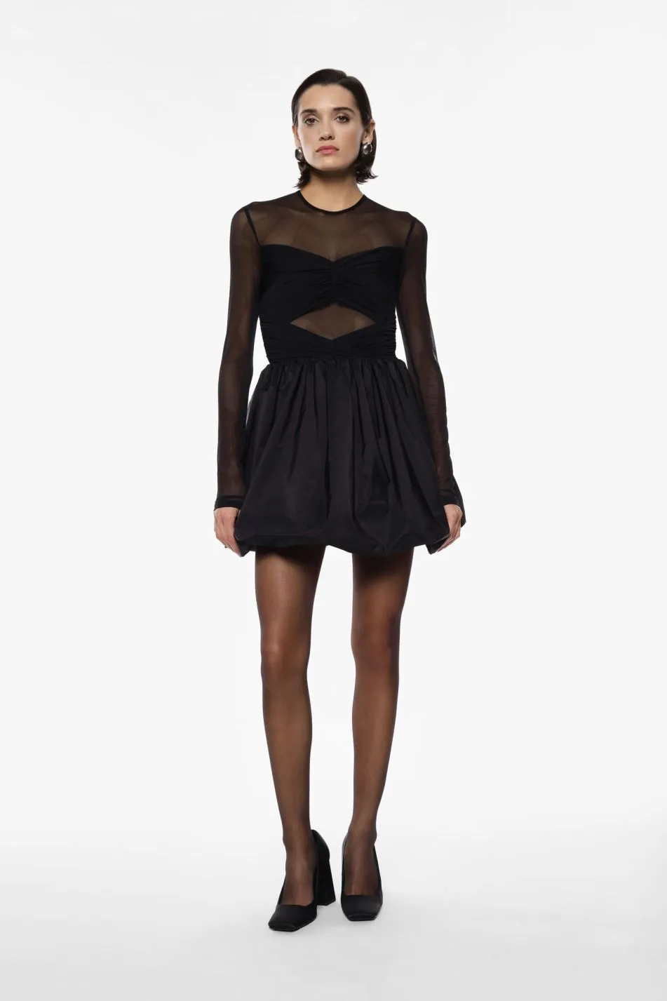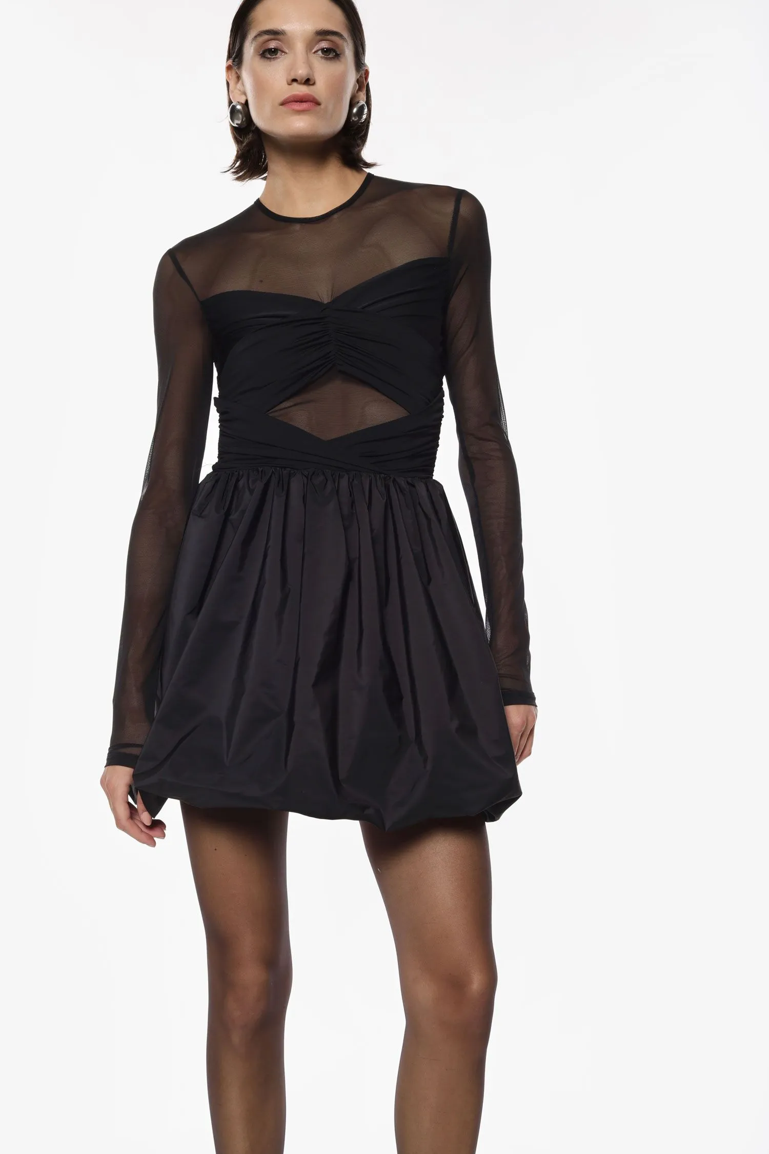 Abito corto dal design sofisticato, caratterizzato da maniche lunghe in tessuto trasparente e dettagli drappeggiati sul corpetto. La gonna ampia e strutturata offre un volume distintivo, valorizzando la silhouette in modo contemporaneo e raffinato. Ideale per eventi serali e occasioni speciali in città.