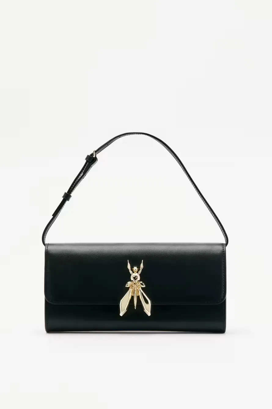 La linea Essential Fly propone un nuovo modello di borsa clutch realizzata in pelle di vitello liscia e strutturata, caratterizzata da un design squadrato. La tracolla removibile permette di modularne la portabilità a spalla o a mano e il logo Fly in metallo, protagonista chunky del modello, aggiunge un tocco distintivo. Un accessorio glam day to night.